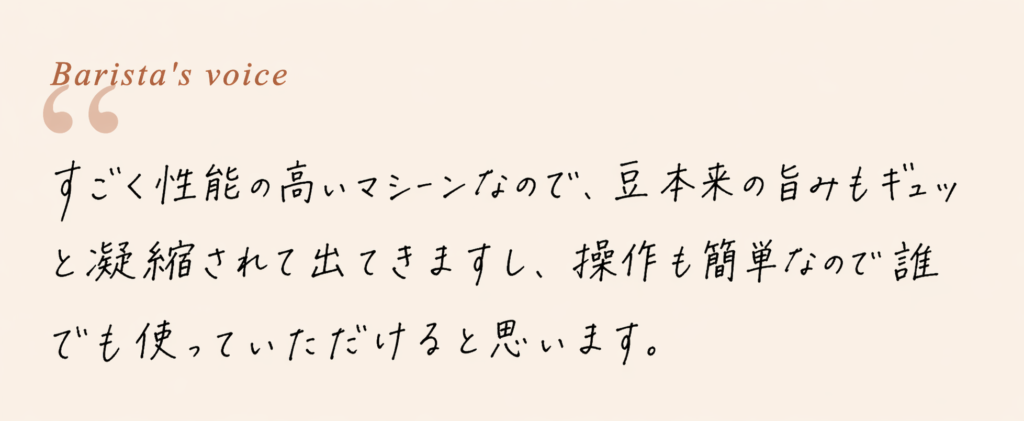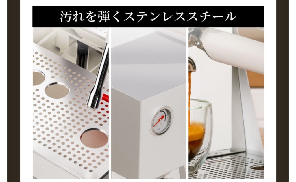 オシャレなデザインかつシンプルな操作性、業務用に近い本格抽出からラテアートまでこなす万能マシン。普段はハイエンドマシンをキッチンに置いて使ってましたが、立ち上がりが圧倒的に早く、今ではハイエンドマシンは押し入れに置いてメインで使ってます!